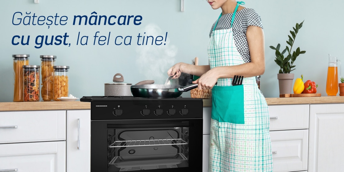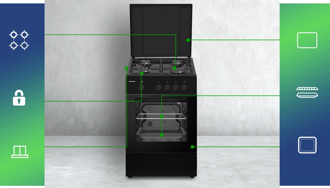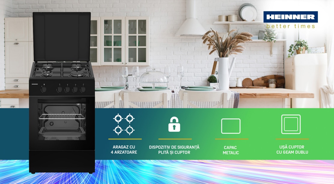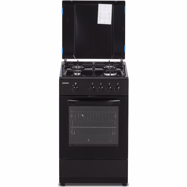 Aragaz Heinner HFSC-SME50BK, Gaz, 4 arzatoare, Dispozitiv siguranta plita si cuptor, 50 cm, Negru