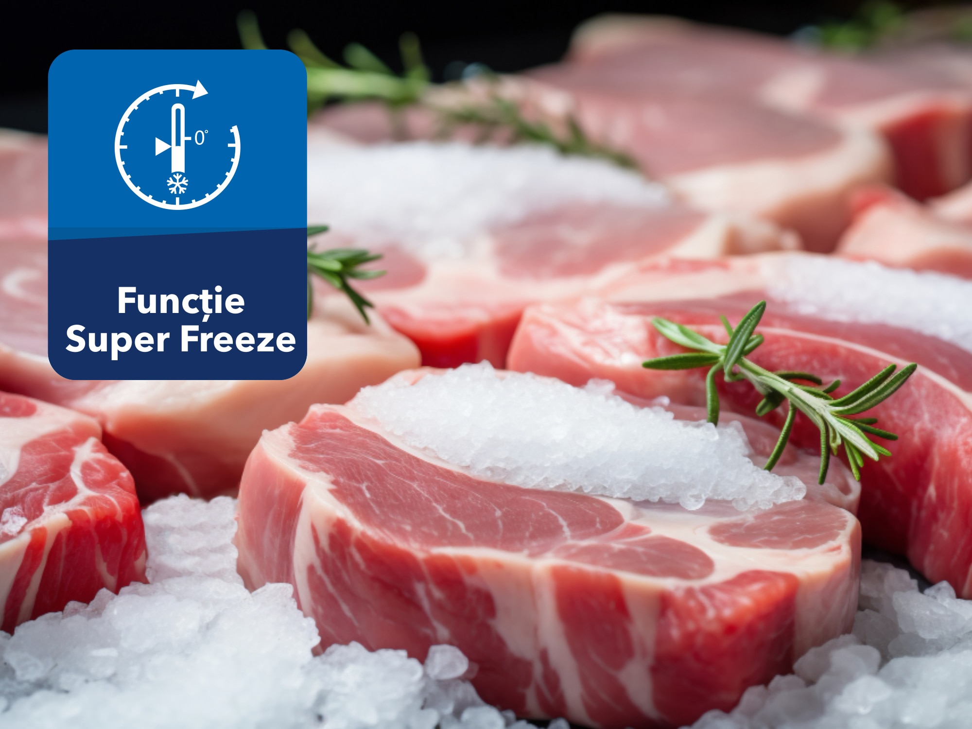 Functia de congelare rapida are rolul de a mentine valoarea nutritiva a alimentelor. Aceasta are ca efect congelarea rapida prin activarea butonului SUPER afisat pe panoul de control electronic.
